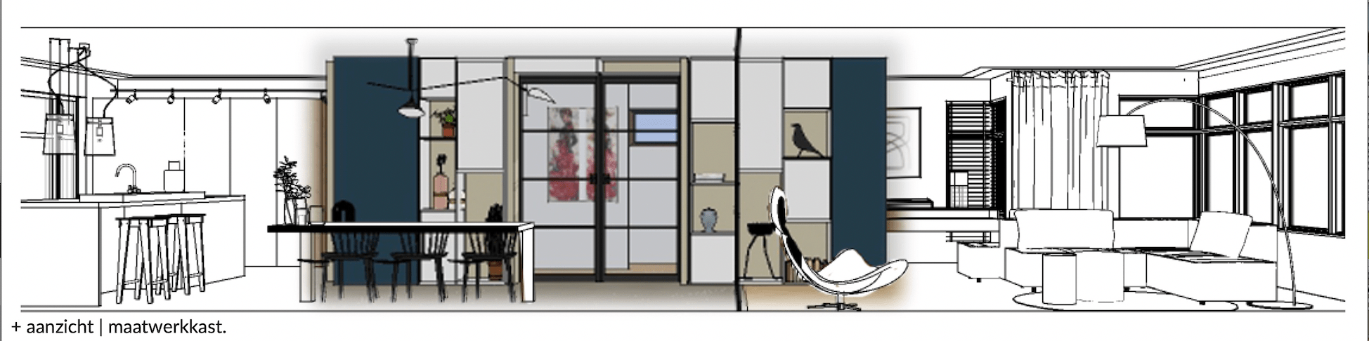 Met een verhuizing naar een ruimere jaren ’30 woning in het vooruitzicht schakelden onze opdrachtgevers ons in om mee te denken over de ideale indeling van de begane grond van hun nieuwe woning. Ze wilden graag keuken en woonkamer ven elkaar kunnen scheiden middels een nieuwe, stalen en-suite. Bovendien zat er een “lastig hoekje” in de woonkamer, waarvan ze niet precies wisten wat ze ermee moesten. Daarnaast waren ze op zoek naar inspiratie voor een warmere woonsfeer. De rustige sfeer in hun huidige woning beviel prima, maar ze misten net dat beetje warmte.